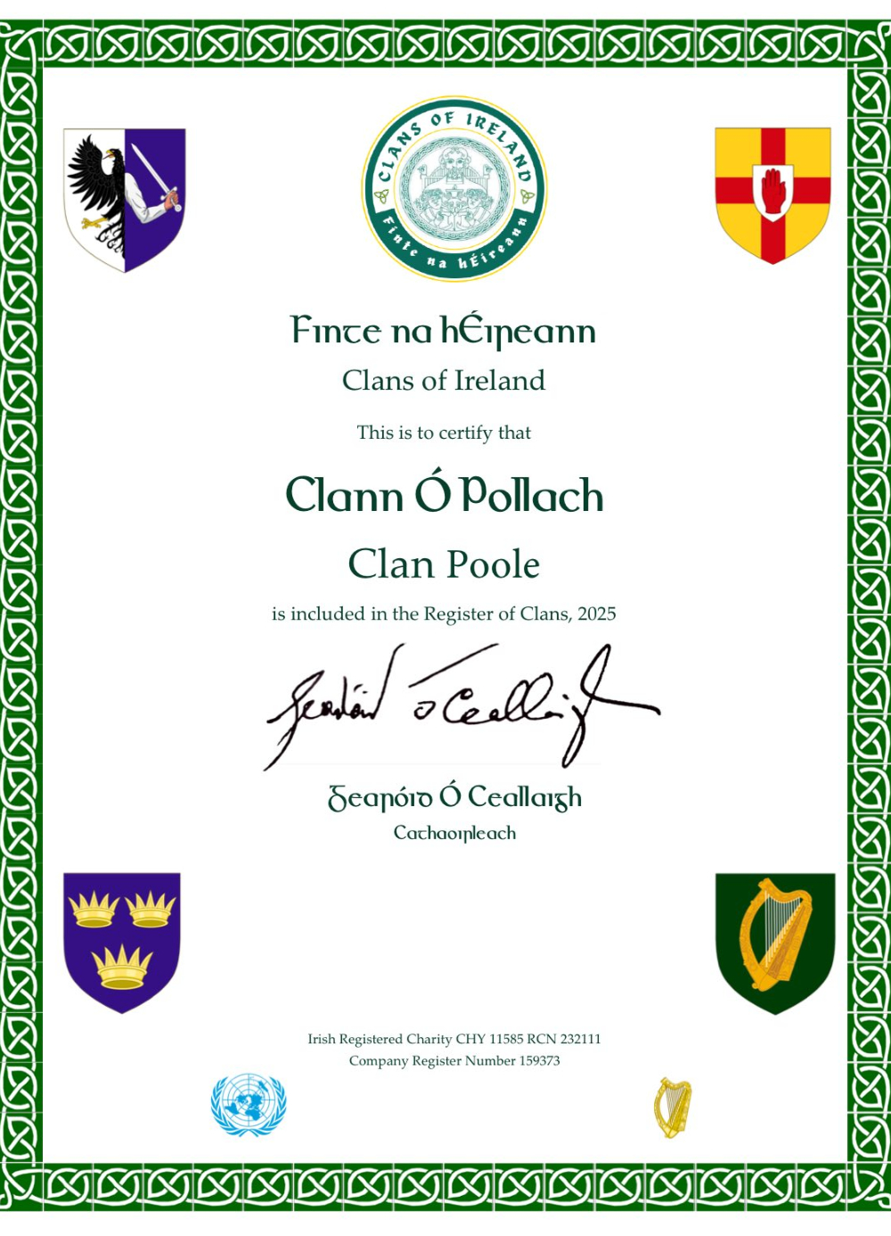 Clan Poole was officially founded on the 7th of March 2019, with the recognition and assistance of the then Registrar of Clans of Ireland, via ancestral decent; but knowing of our Maternal lineage for decades prior, so when it’s stated that we’re a young Clan, in the scale of the Clans before us we are “young”, standing centuries apart.In 2024 we undertook YDNA testing, Big Y-700 on the elected Chiefly line, this has shown that our Paternal bloodline stems from Connacht in western Ireland around 200CE. Our Chiefs Haplogroup is R-BY21233 that can be traced back to R-DF104 & R-DF105, as well as the wider R-M222. This places our Clan within the decent of ancient Celtic Noble ancestry. A public notice can be found in our news section here with the result from our Ad Hoc Derbhfine to elect our Inaugural Clan Chief/Clan Commander.Now while you are here you will find we’re a diverse bunch, whatever your creed, religion, orientation you’ll find that you’re most welcome here with us.Family, Charity and Heritage are our main aims, you put your family first always, then if you’re in a position to aid those less fortunate than ourselves, please do so, and honour your history, where we come from helps us in where we’re going.Clan/House genealogy and DNA projects, we’ll help with family tree research and we urge that members of the Clan (with the Poole surname) run DNA projects to see how diverse us Poole’s are.Folk with the name Poole and variants thereof are by right already a member of the Clan, (non-subscribed) be you choose to be active or not.Be you a Poole, Pool, Pooley, Pooly, Pole, Polle, Pull and other variations of the surname.You don’t need to carry the name Poole to become a member of the Clan, people with a love of Ireland, Scotland and Wales with the History and heritage of those lands all things Celtic, are welcome to become members.And if you’re willing you can even hold office if your part of the world is lacking Clan leadership. Click here if you’d like to enquire about holding a Clan Office.Within Clan Poole our Chief is the custodian of the Lordship of Shevington, enabling him to use the style of Lord of the Manor, or Lord of Shevington, which in feudal times was a form of nobilty, first created inthe year 1288, but today the Lordship is more regarded a feudal dignity.